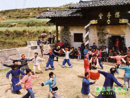 “茅古斯與擺手舞”是土家族紀(jì)念祖先開(kāi)拓荒野、捕魚(yú)狩獵等創(chuàng)世業(yè)績(jī)的一種原始戲劇形式,被中外的戲劇界稱為是人類戲劇文化的“活化石”,茅古斯是土家族最古老的舞蹈,也是傳授狩獵技藝的民間武術(shù),體現(xiàn)土家族先民的生活情態(tài)。
