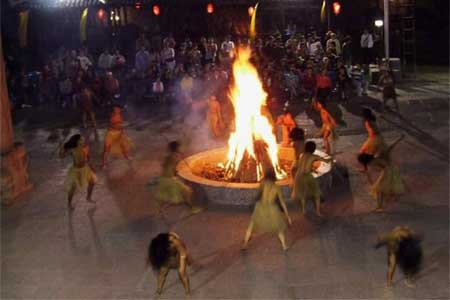 擺手舞的形式一般是這樣的:在擺手堂的中央高掛龍旗,四方點(diǎn)燈,由金童玉女給土家人用銅盆洗手,再?gòu)南慊鹕饺?lái)神火,然后在龍旗下點(diǎn)燃3堆篝火。隨著3聲炮響,先由梯碼法師(巫師)手舉八寶銅鈴作前導(dǎo),大家跟著翩翩起舞,徹夜不眠。