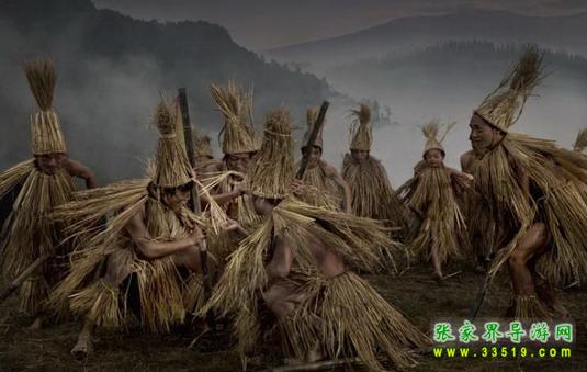 毛古斯,這是土家族最原始、最古老、最粗獷的一種歌舞。表演這種歌舞的人,全身上下裹稻草,腰纏稻草辮,前面還有一根用紅布包頭做的小圓棒。頭上也戴著由稻草扎成的草辮。領(lǐng)頭跳的叫“老毛古斯”,跟著跳的叫“小毛古斯”。其中一個(gè)扮演“古魯子”(類似騙子與歹徒),其余形象一般相同。演員們邊跳舞并發(fā)出“嗨嗨”之聲。舞蹈內(nèi)容主要反映土家人古代原始生產(chǎn)斗爭(zhēng),如打獵、捕魚(yú)等等。