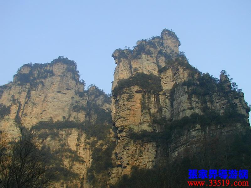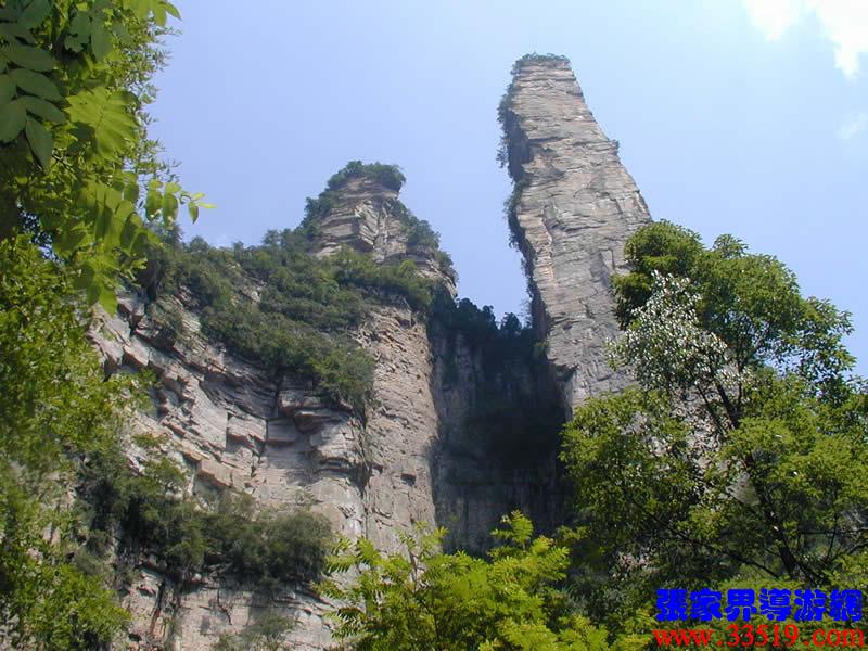 (金鞭巖、神鷹護(hù)鞭)如果要問張家界國家森林公園的標(biāo)志景點(diǎn),答案是現(xiàn)成的:金鞭巖。早在清代中期,一些文人就把張家界的峰林及百丈峽列入“永定八景”。其一叫“危峽啼猿”;其二叫“層巖涌塔”:“縣西二十里青崖山,其前五山并立,層峙如浮圖。中一峰更峻拔,上插宵漢,晴輝雪積,最擅奇觀。”這里說的“其中一峰”,指的金鞭巖。八大景點(diǎn)張家界占其二,可見先人是有眼力的。金鞭巖相對(duì)高度380多米,拔地而起,直插云霄,無論你遠(yuǎn)看近看,正看側(cè)看,都是一根刺破青天的長鞭!在金鞭巖左側(cè)的那座巖峰,大家看多像一只兇猛的老鷹,勾嘴瞪眼,雙翅略展,時(shí)刻警覺地守護(hù)著金鞭,人稱“神鷹護(hù)鞭”。
