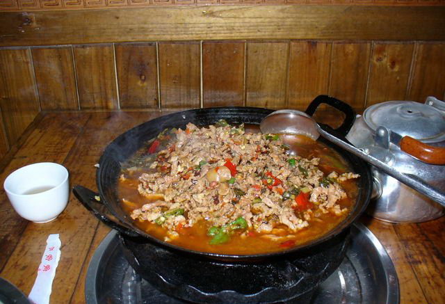 介紹: 血豆腐,就是將豆腐和豬血、豬肉及花椒、辣椒等佐料拌成泥狀,捋成卵形,以竹篩置火炕上,煙熏烤成臘黃,吃起來耐嚼味香,是土家特色菜,當(dāng)?shù)厝顺R云湎戮啤?在張家界的飯館里很難吃到正宗的土家特色菜,可以去做土味的特色餐館去解解饞。但是最正宗還是鄉(xiāng)下人家家里自己熏的,那才叫一個好吃?。?!