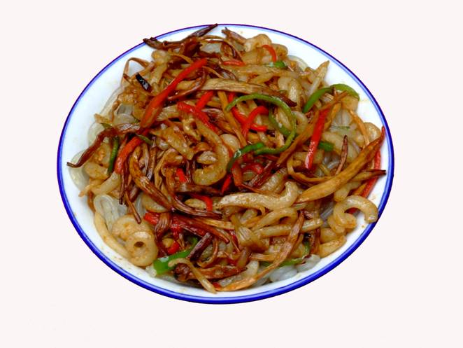 張家界草帽面》。 這個名字的由來是因為老板常年戴著草帽賣面,臊子非常香,可以添加,面是他自己加工的據(jù)說是全手工的,老板人很古怪,每天只賣那么一點,以前更古怪,只有星期1、3、5的晚上9點才有賣,想吃他家的草帽面居然還得跟他打電話問他是否心情好,出不出來賣面?預(yù)約了才不會撲空。但是就因為這點神秘,所以他家的面有些神話色彩。在汽車站口百貨大樓東門對面的巷子口,一輛板車上面掛了一頂草帽,那就是了,不過每天下午1點左右就沒了,要吃啊,嘿嘿,您趕早!能不能吃的上,得看您造化咯!