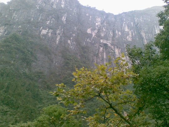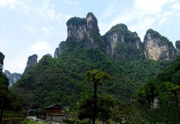 從玉鉆峰沿公路向北行2公里,但見溪谷兩岸石壁陡峭如削,高千仞,絕壁間石紋如畫,青白相間,加上有古木翠草點(diǎn)綴,如同畫屏。這就是“天門畫壁”。走過“天門畫壁”,便見三座石峰緊緊相連,這就是“相依巖”。高200余米,活象三個(gè)石人相依而立,靠前的一個(gè)是頭戴銀花首飾、身著百褶花羅裙的苗姑,緊靠后的一個(gè)是頭纏花帕、身穿對(duì)襟短衣的苗族男子,靠左的一個(gè)是頭纏絲帕、身著胸襟式土布衣的老媒人。