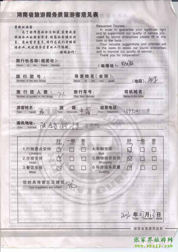 2010年7月13日陜西張先生一行7位旅游質(zhì)量反饋