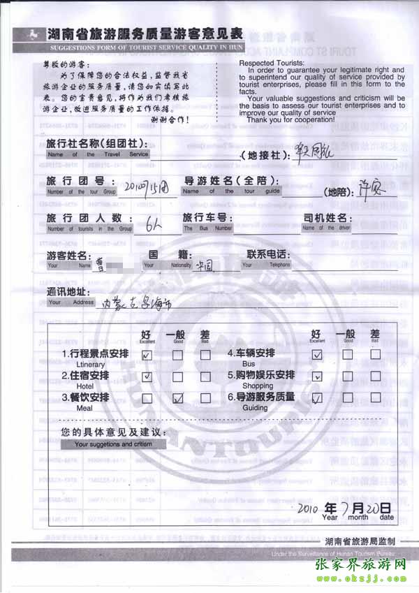 2010年7月20日內(nèi)蒙曹先生一行6位旅游質(zhì)量反饋