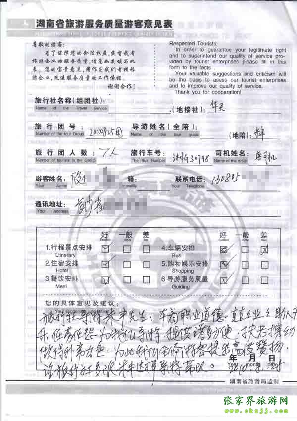 2010年8月25日長沙攸小姐一行7位旅游質(zhì)量反饋:導游特別優(yōu)秀
