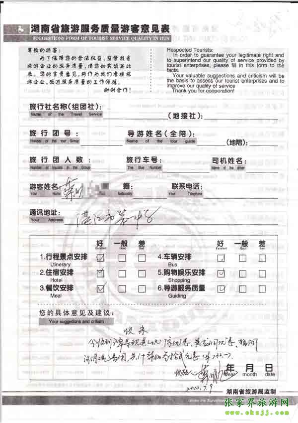 2010年7月9日蔡先生旅游質(zhì)量反饋