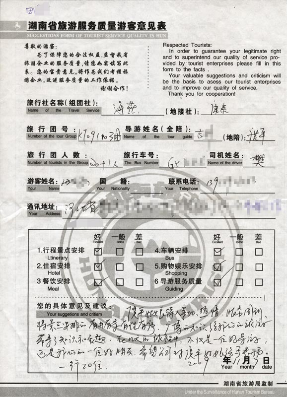 2009年11月3日河北田先生一行20人旅游接待質(zhì)量反饋單: