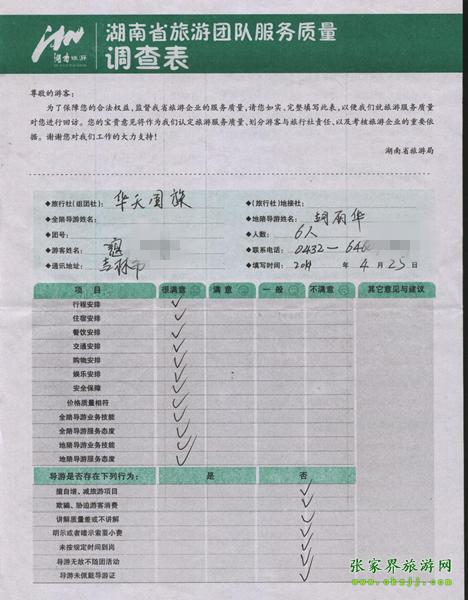 2011年4月25日寇先生一行6人旅游質(zhì)量反饋
